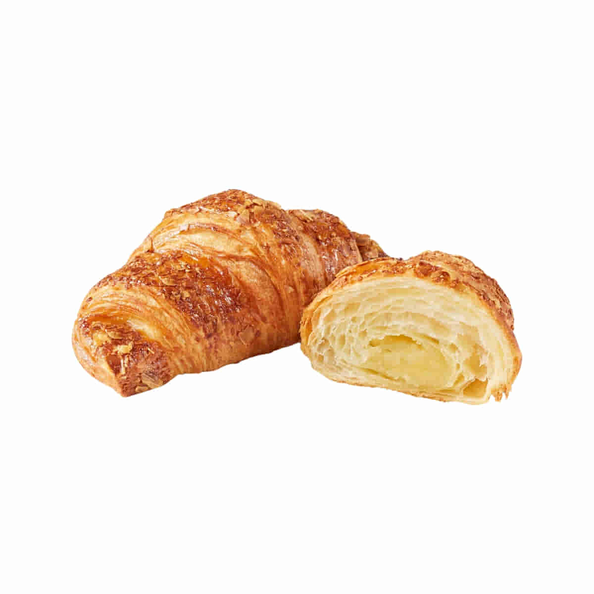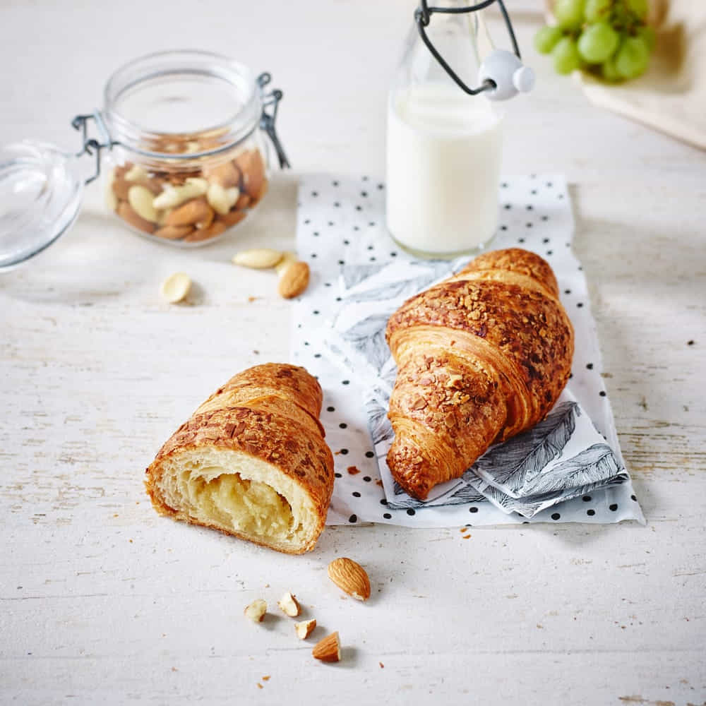 Exquisite croissant with real almond filling, uniform appearance and Golden crust. Deep frozen unbaked pastry with 19% filling, 0,7% coating and 2,1% topping