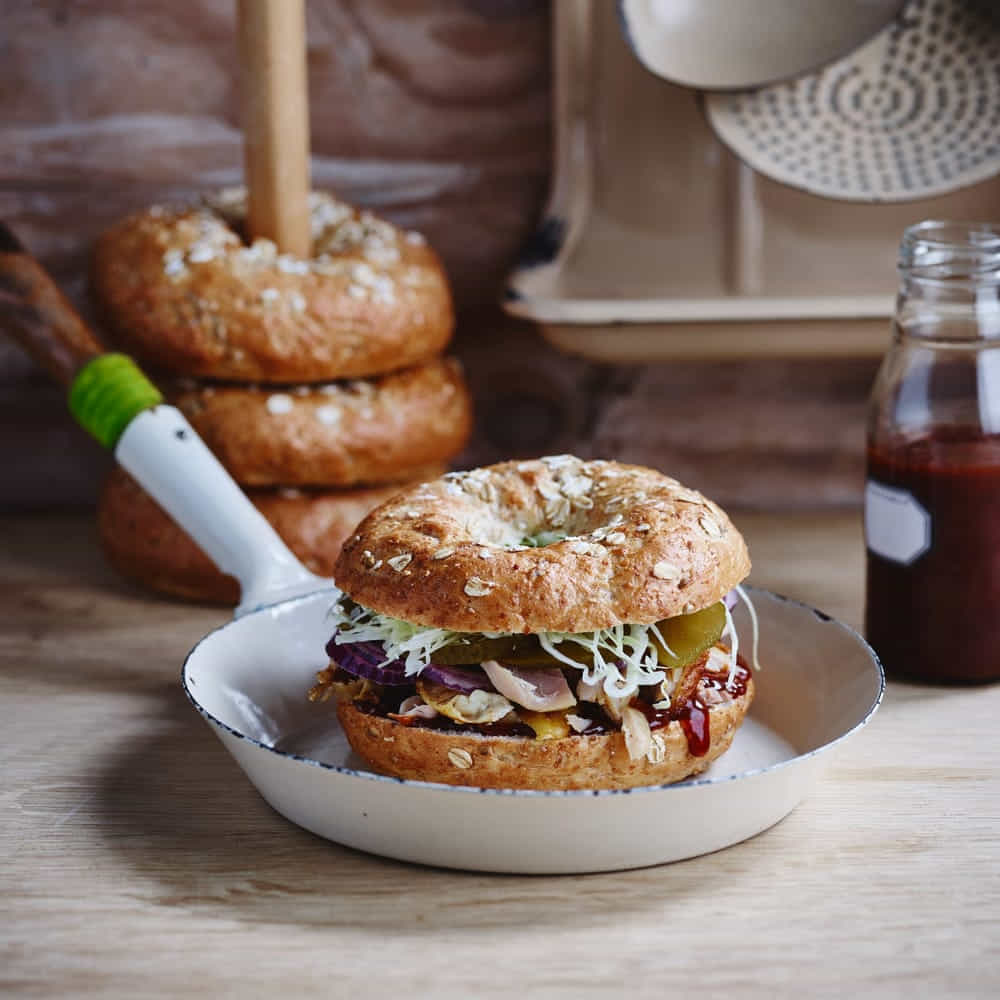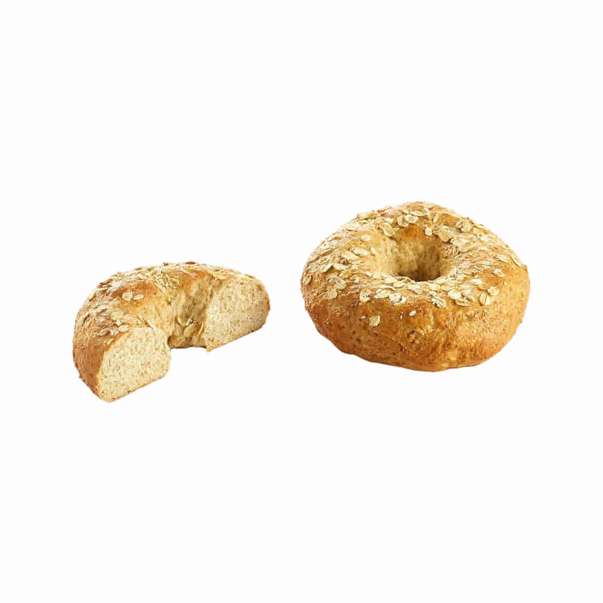 A ring-shaped light to malt brown with a small hole in the middle, topped with even distribution of poppy seeds, linseeds and barley flakes.
