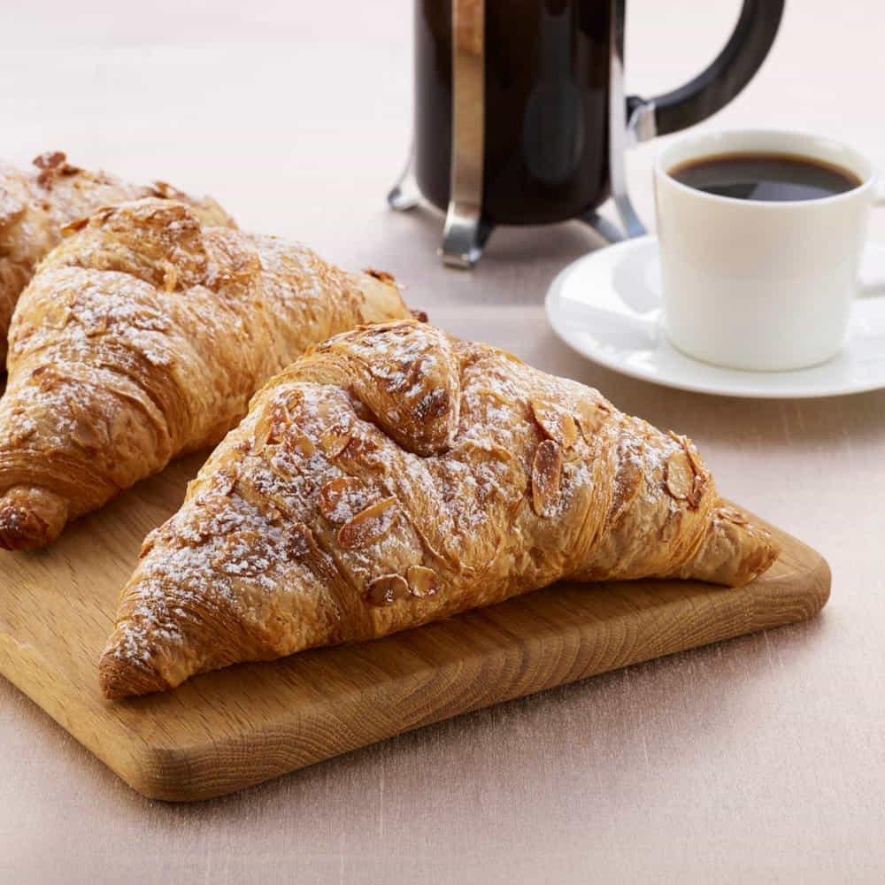 An unbaked, frozen, pre proved all-butter croissant, filled end-to-end with almond paste and topped with flaked almonds.