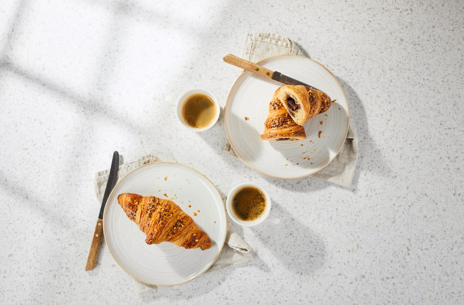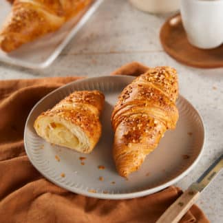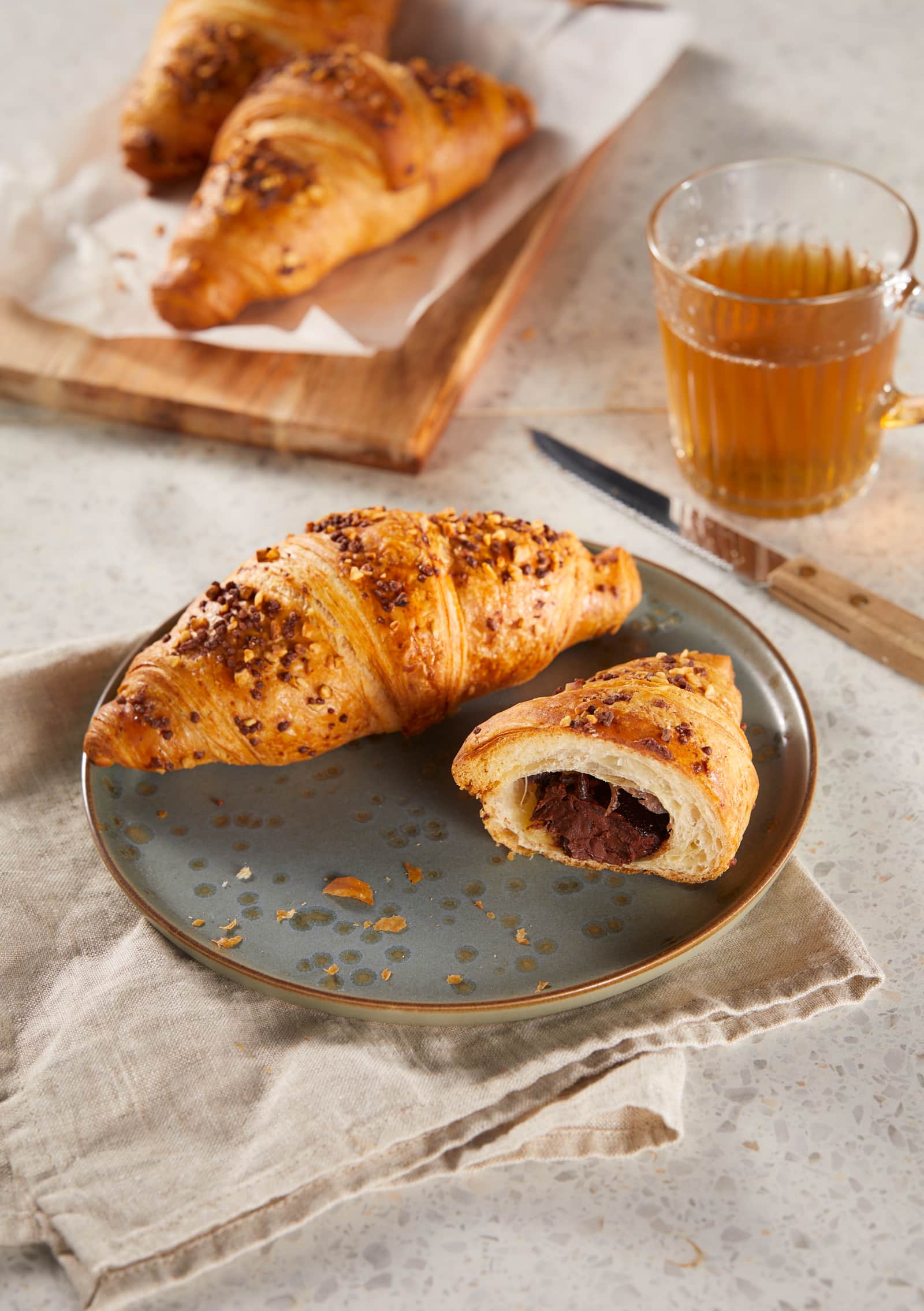 Butter croissant filled with a smooth chocolate hazelnut filling, sprinkled with hazelnut bits and crunchy cocoa sugar pearls. Made with 15% butter .