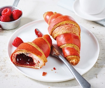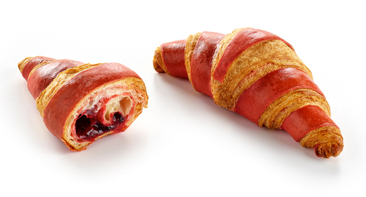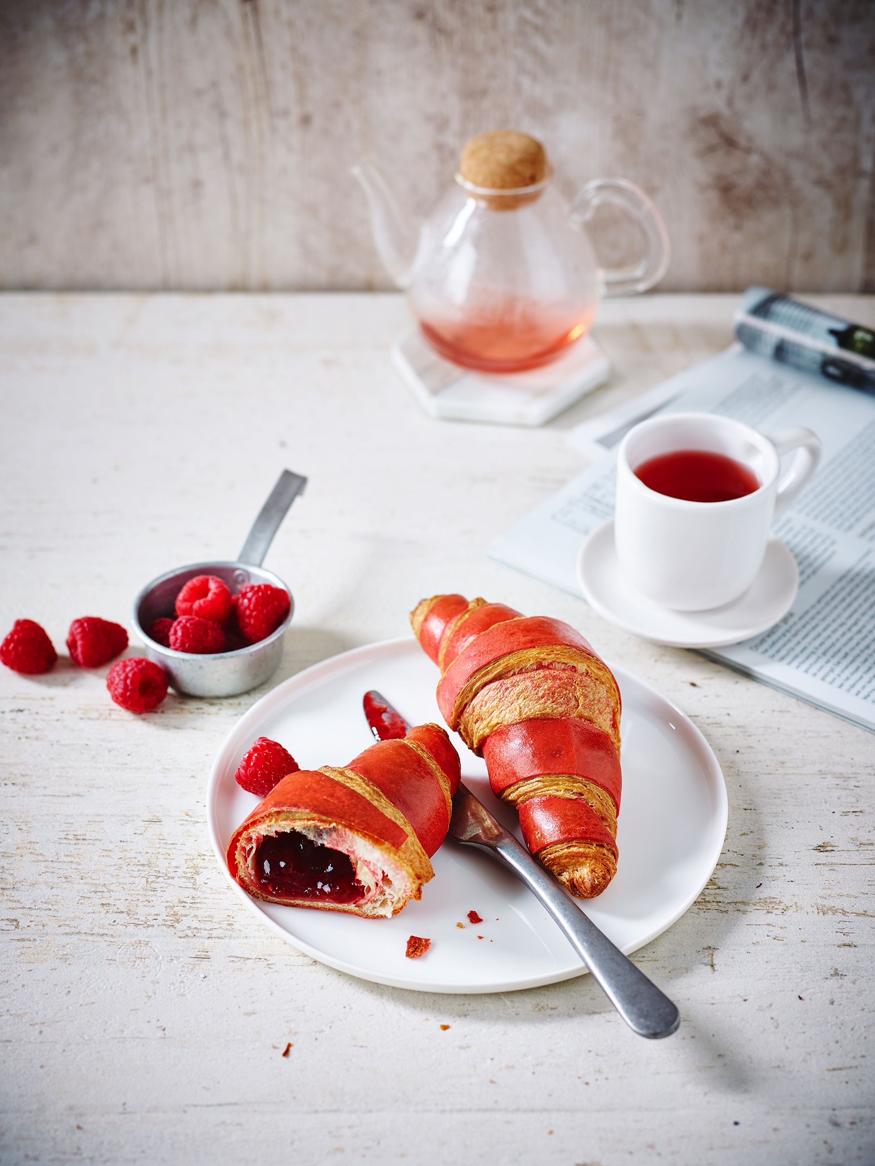 Voluminous nice layered double coloured butter croissant created by the embracement of two flavours of laminated yeast dough (natural and raspberry) infused with a rich raspberry filling. Made with 16% butter (share of total recipe).