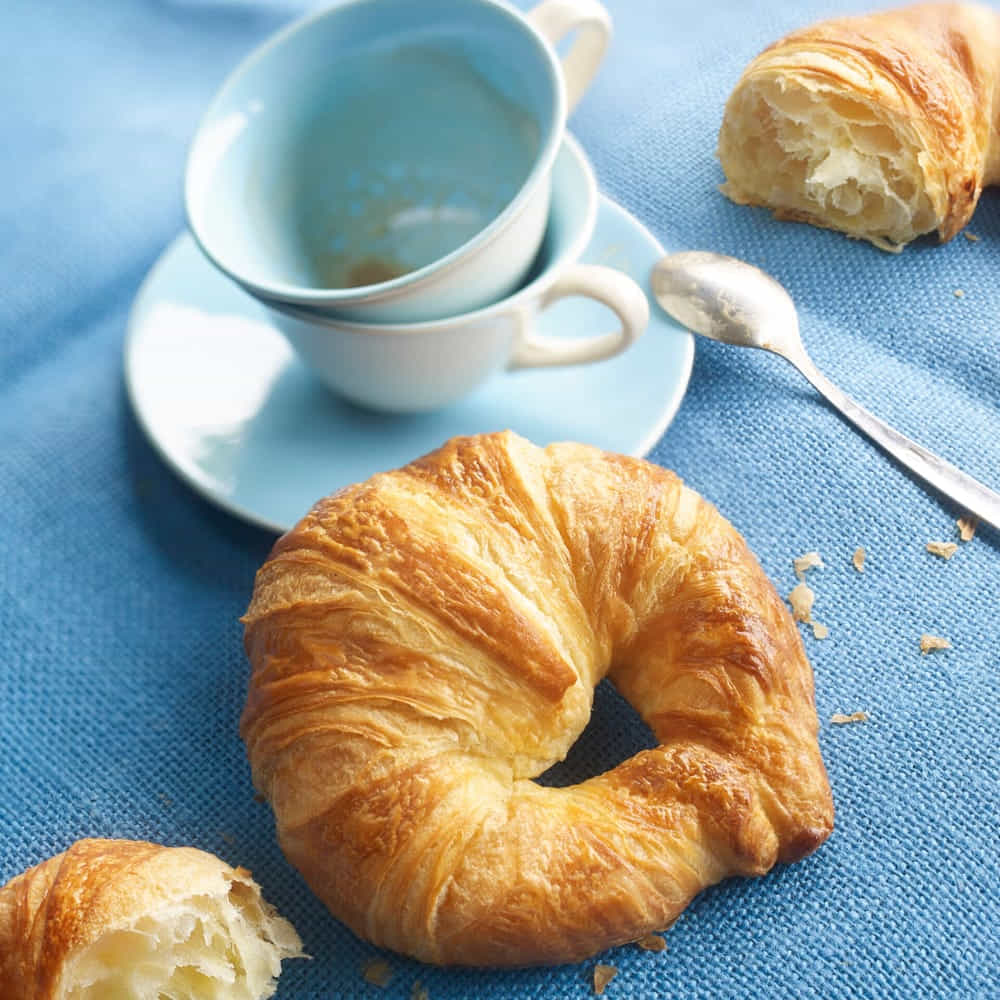 Curved margarine croissant with a nice volume, rich taste and nice layering, pre-proofed & egg-washed.