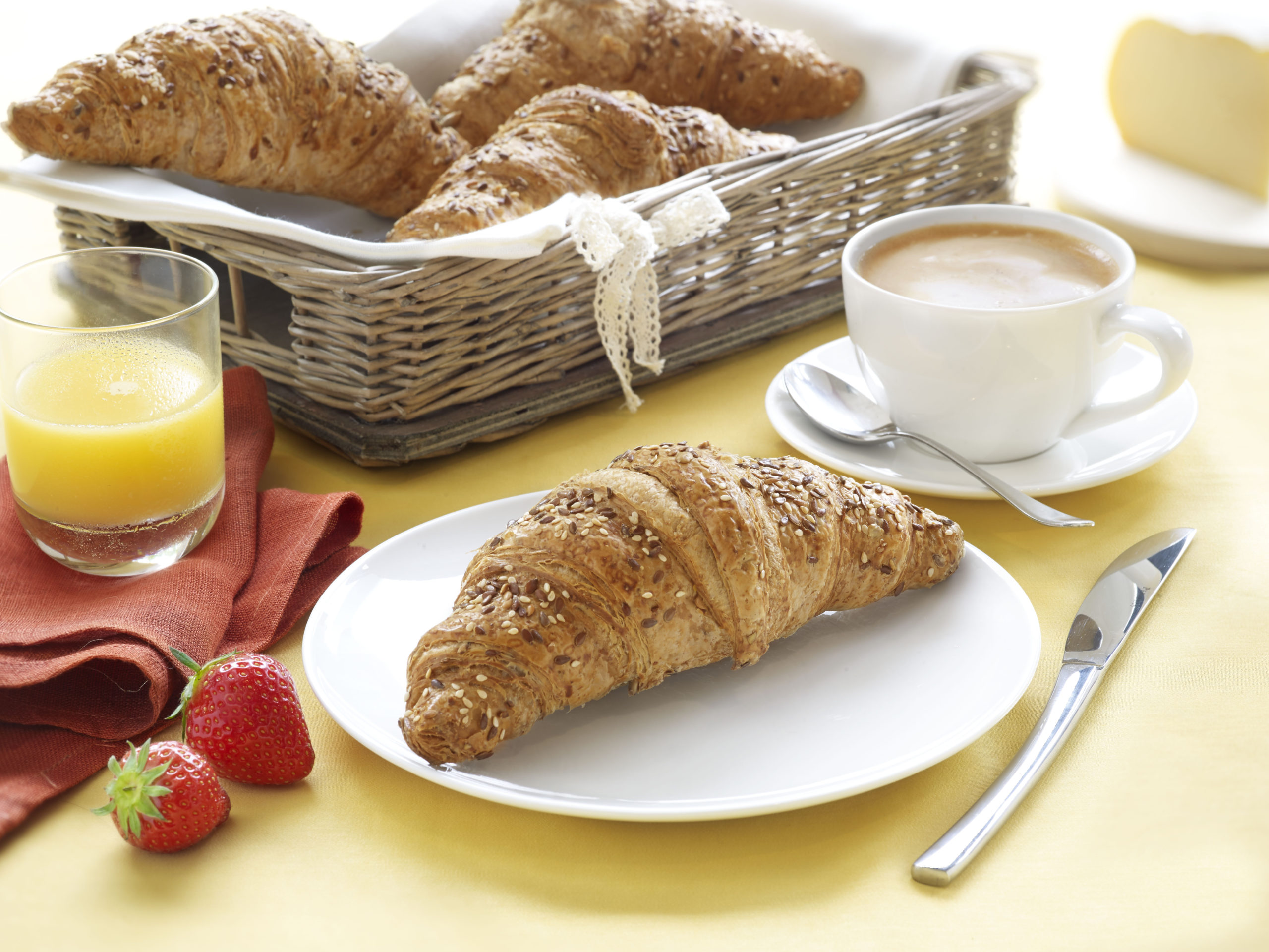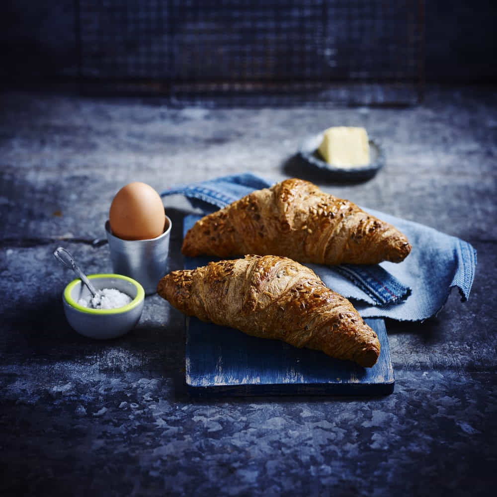 A delicious and richly decorated multigrain butter croissant with rye flour, roasted barley malt flour & spelt flour, linseed and sunflower seeds. Made with 19% butter (share of total recipe).