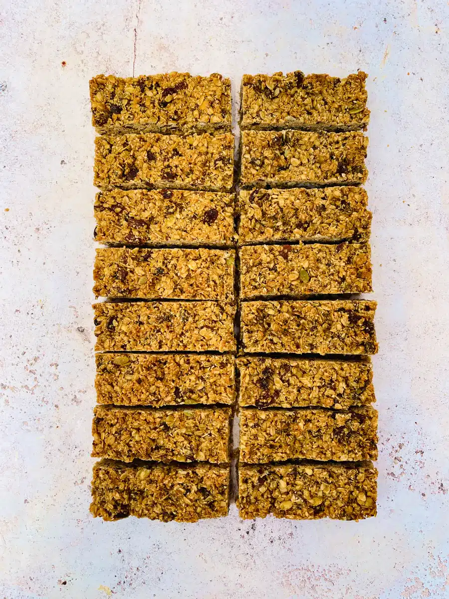 Energy filled bar made with real butter, rolled oats packed with pumpkin seeds, sultanas and dates