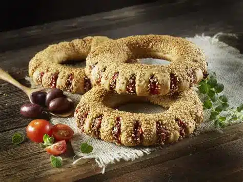 Ingredients:Wheat flour (gluten), 24% tomato sauce [tomato, water, modified starch, sugar, vinegar, thickener (methylcellulose), gelling agent (sodium alginate), herbs, spices, preservative (potassium sorbate), stabilizer acidity (citric acid), sugar], vegetable margarine [vegetable oils and fat (palm oil, palm stearin, soybean oil), water, table salt, emulsifiers (mono- and di-glycerides of fatty acids and fatty acid polyglycerides), acidity regulator: citric acid, preservative: potassium sorbate, coloring: b-carotene, flavoring], water, olives (vinegar), sesame seeds, corn starch, vegetable fats (vegetable oils and fats, coloring: b-carotene, flavoring), table salt, sugar, basil, pepper, emulsifier: sodium steatyl-2-galactylate. Reference Intake: Each 100g portion contains