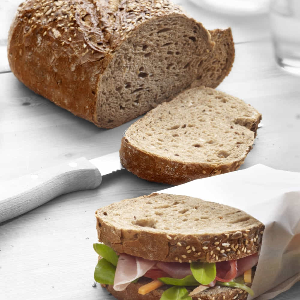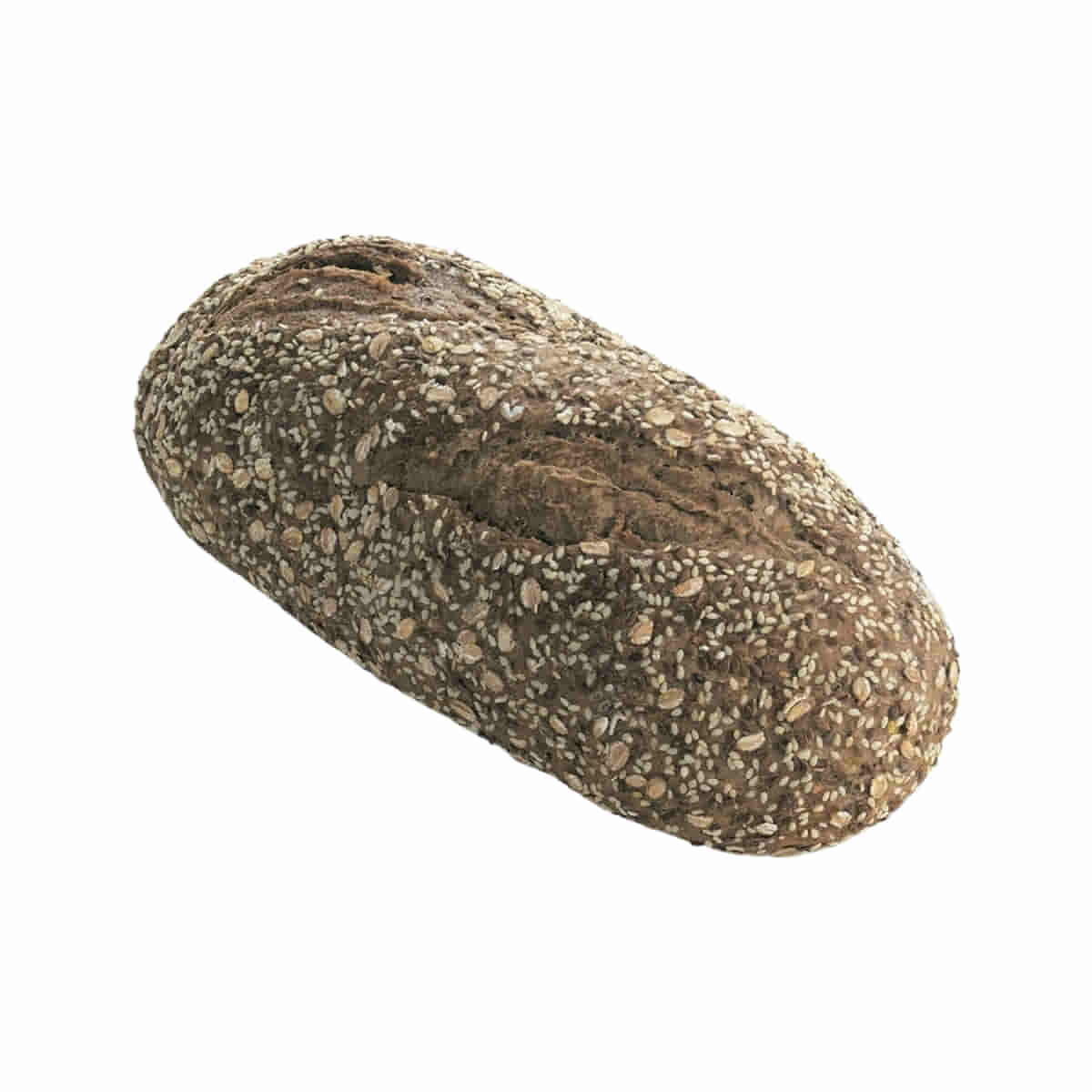 Enriched, dark, medium size sourdough loaf from wheat flour, rye flour and malt, with a thin crispy crust and a light airy crumb, decorated with sunflower seeds, wheat brans, sesame seeds, linseed and oat grits.