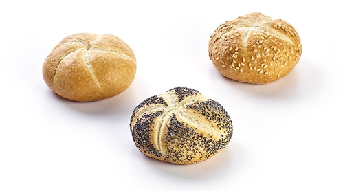 Mini kaiser roll natural (WHEAT flour, water, yeast, salt, emulsifier (E472e), flour treatment agent (ascorbic acid)), Mini kaiser roll with poppy (WHEAT flour, water, poppy seeds (3,9%), yeast, salt, emulsifier (E472e), flour treatment agent (ascorbic acid)), Mini kaiser roll with sesame (WHEAT flour, water, SESAME SEEDS (3,9%), yeast, salt, emulsifier (E472e), flour treatment agent (ascorbic acid)).