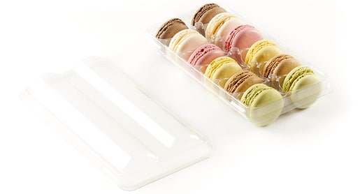 Assortment of “Macarons de Paris” in 6 different tastes: chocolate, raspberry, pistachio, lemon, vanilla and mocha flavoured macarons; packaged in a black blister by 2 of each flavour.