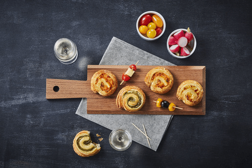 Pizza Swirl: WHEAT flour, water, fine butter (MILK) 11%, tomatoes 9%, grated emmental cheese (MILK) 7%, sugar, yeast, black olives 3%, mushrooms 3%, whey powder (MILK), EGGS, modified starch, salt, egg wash (EGGS, water), WHEAT gluten, sunflower oil, basil, non-hydrogenated vegetable oil (coconut), skimmed MILK powder, thickener (sodium alginate), hen's EGG yolk powder, onion, flour treatment agents (alpha-amylases, hemicellulases, ascorbic acid), acid (citric acid), antioxidant (ascorbic acid), garlic. Cheese Swirl: WHEAT flour, water, fine butter (MILK) 11%, grated emmental cheese (MILK) 10%, EGGS, whey powder ( MILK), yeast, sugar, modified starch, egg wash (EGGS, water), salt, WHEAT gluten, non-hydrogenated vegetable oil (coconut), skimmed MILK powder, thickener (sodium alginate), hen's EGG yolk powder, flour treatment agents (alphaamylases, hemicellulases, ascorbic acid). Pesto Swirl: WHEAT flour, water, fine butter (MILK) 12%, pesto 8% (basil, non-hydrogenated vegetable oil (rapeseed, olive), cheeses (MILK, salt, microbial coagulant), garlic, salt, acid (citric acid)), whey powder (MILK), yeast, sugar, modified starch, EGGS, egg wash (EGGS, water), salt, WHEAT gluten, non-hydrogenated vegetable oil (coconut), skimmed MILK powder, thickener (sodium alginate), hen's EGG yolk powder, flour treatment agents (alpha-amylases, hemicellulases, ascorbic acid). Barn laid eggs.