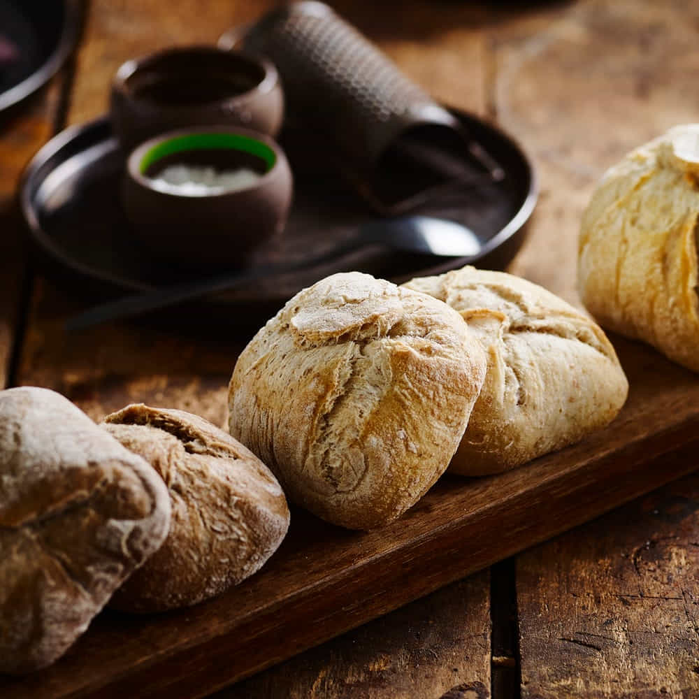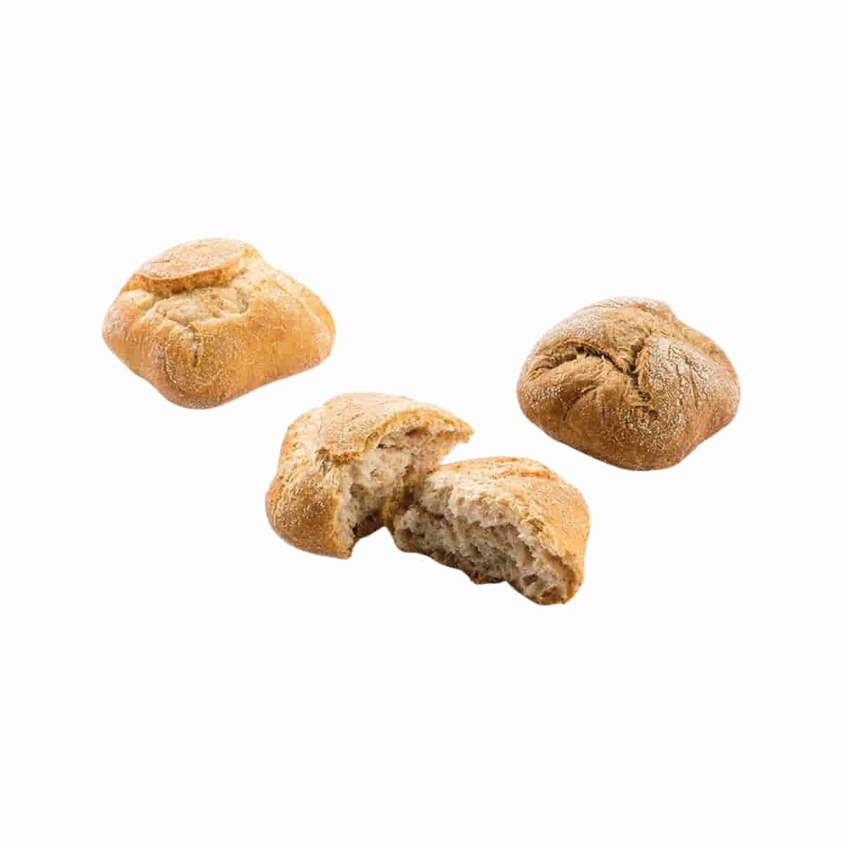 Mixed box of artisanal mini wheat rolls (ciabatta type of dough), each of them hand folded, flour dusted and baked on stone: 35 white wheat rolls, 35 wholemeal rolls, 35 dark wheat rolls with barley malt.