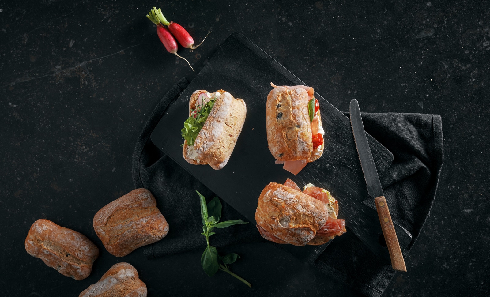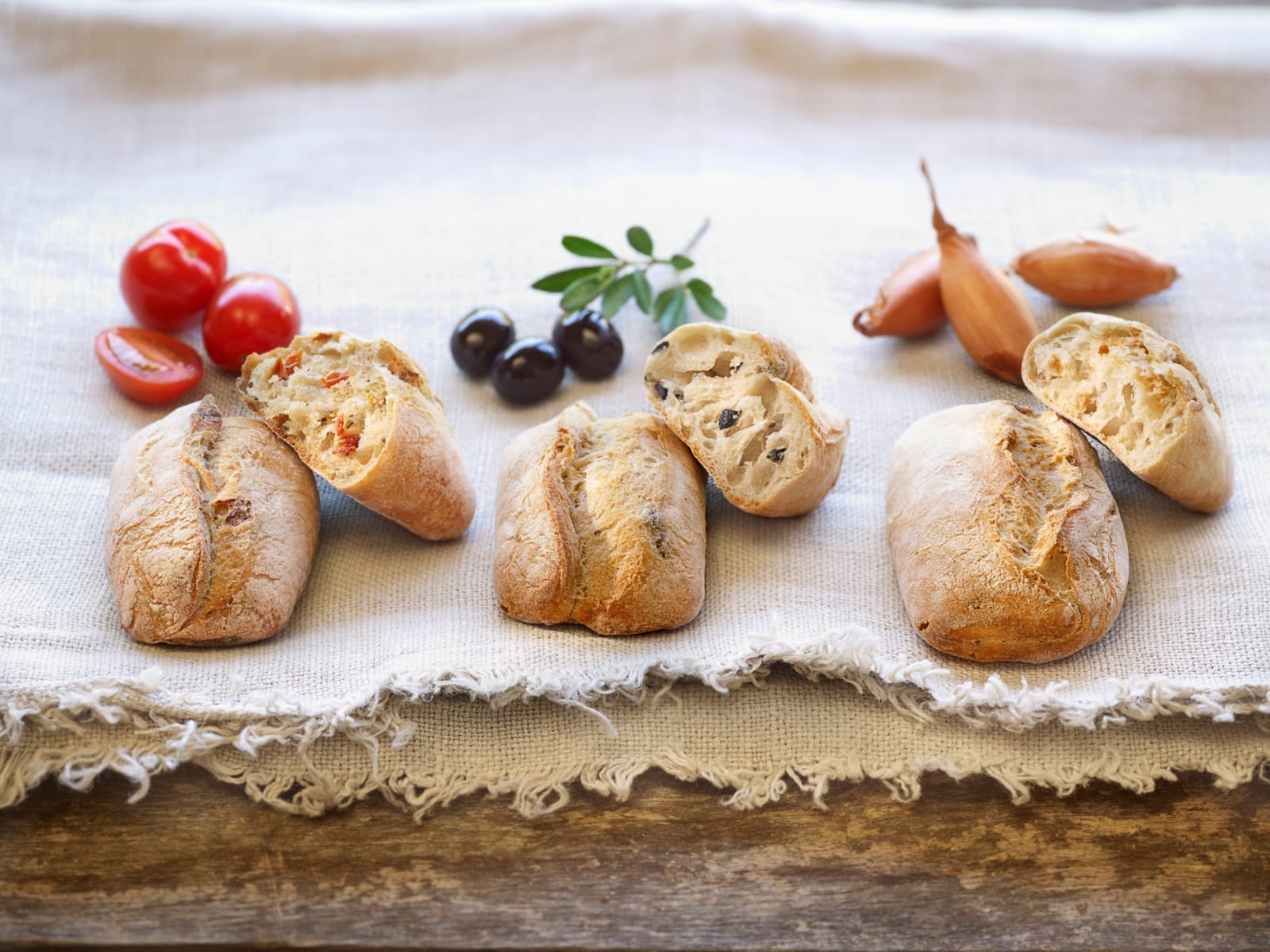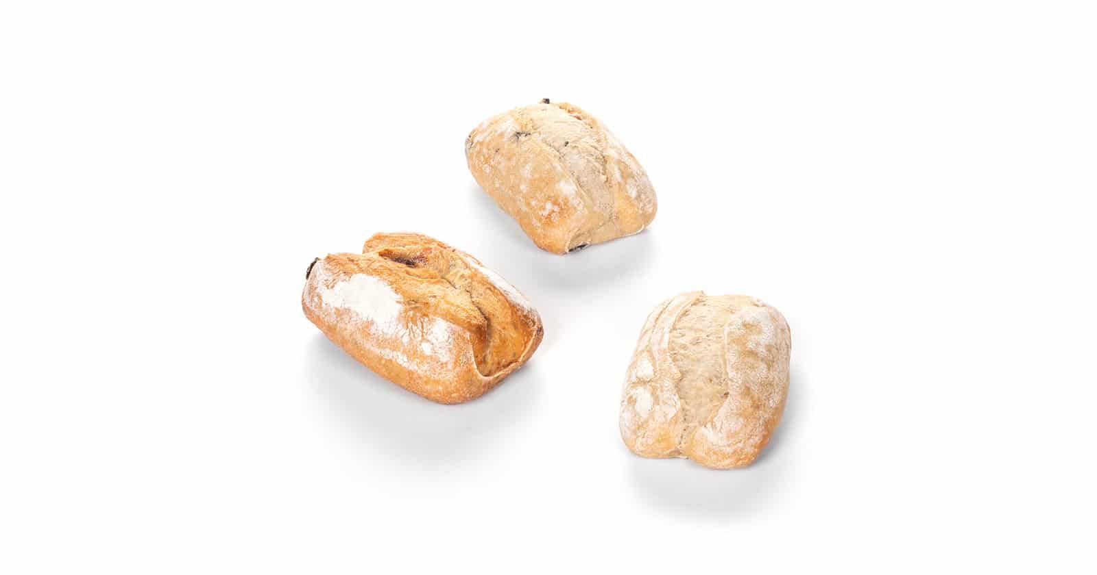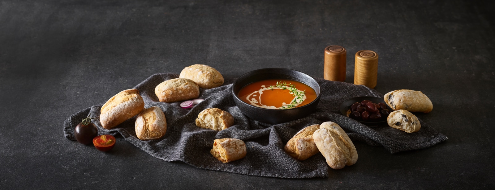 Mixed box of artisanal mini wheat rolls in three flavours: 12 tomato rolls, 12 onion rolls and 12 rolls with black olives; baked on stone. To accompany soups & salads.