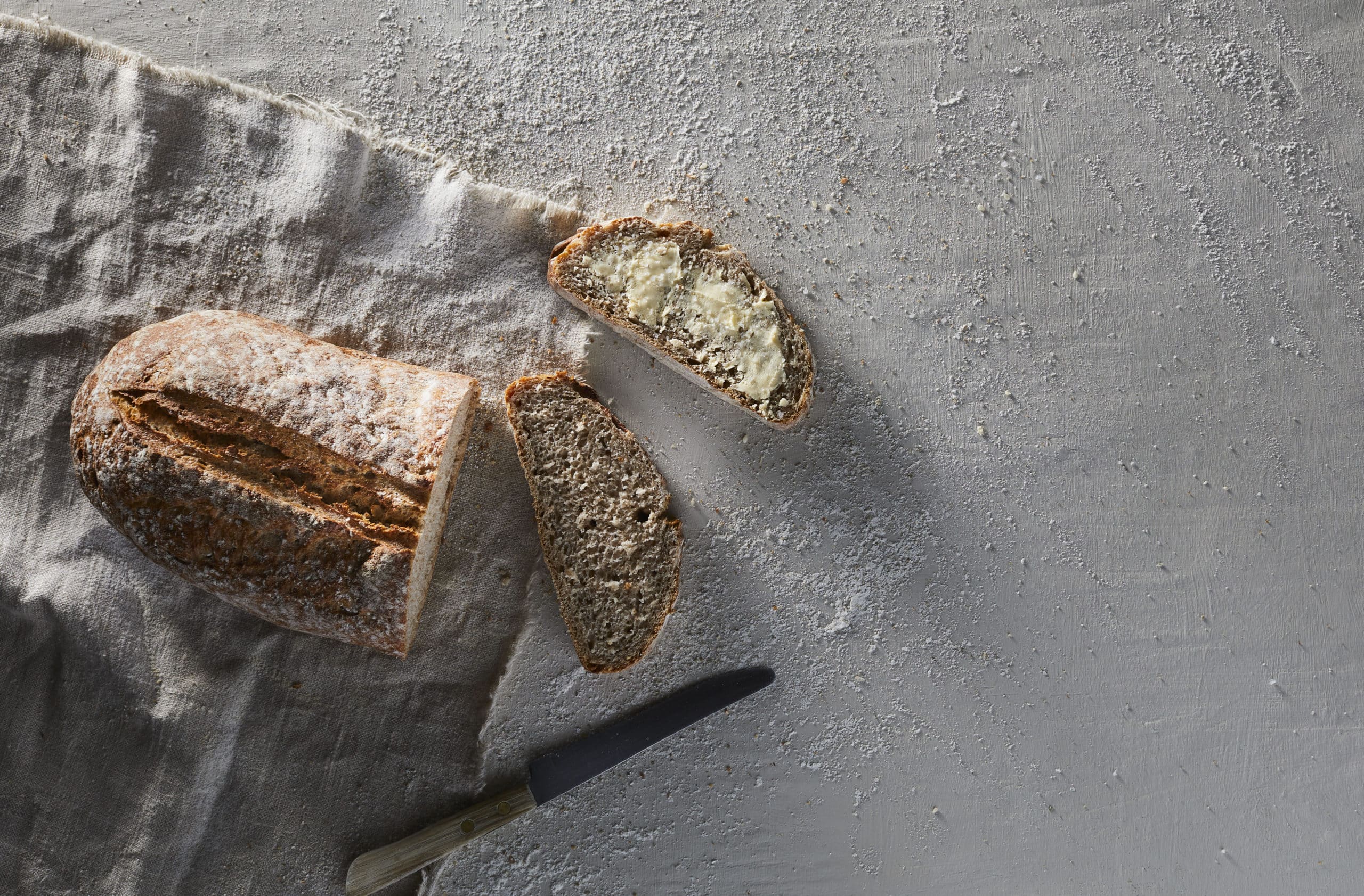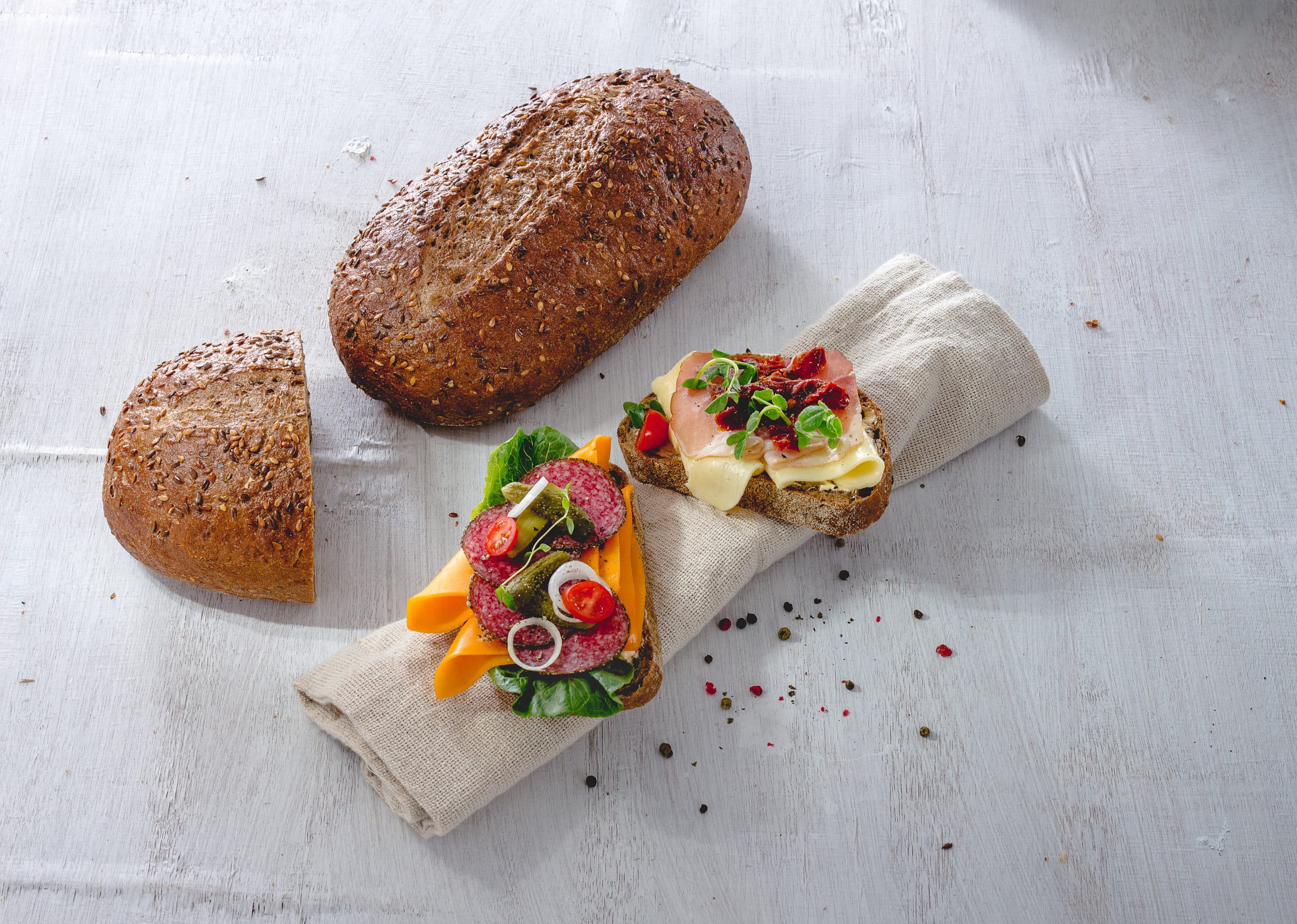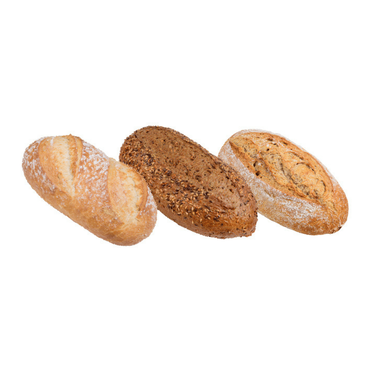 Artisanal wheat rye loaf (WHEAT flour (39,5%), water, RYE flour (18%), WHEAT sourdough (6%), RYE sourdough (3%) (water, fermented RYE flour, salt), bran (RYE) (3%), salt, gluten (WHEAT), yeast, flour treatment agent (E300)), Bread Batard Campagne (WHEAT flour, water, WHEAT sourdough (6,3%), dried sourdough (WHEAT) (1,9%), salt, yeast, flour treatment agent (E300)), Royal sourdough bread with seeds (water, WHEAT flour (35%), whole WHEAT flour (16%), WHEAT sourdough (5%), yellow linseed (4%), brown linseed (4%), sunflower seeds (3%), RYE flour (3%), RYE sourdough (2%) (water, fermented RYE flour, salt), salt, yeast, pregelatinized WHEAT flour, roasted malt flour (WHEAT), BARLEY malt extract, bran (WHEAT), flour treatment agent (E300)). May contain traces of: eggs, soya, milk, mustard, sesame seeds, lupin.