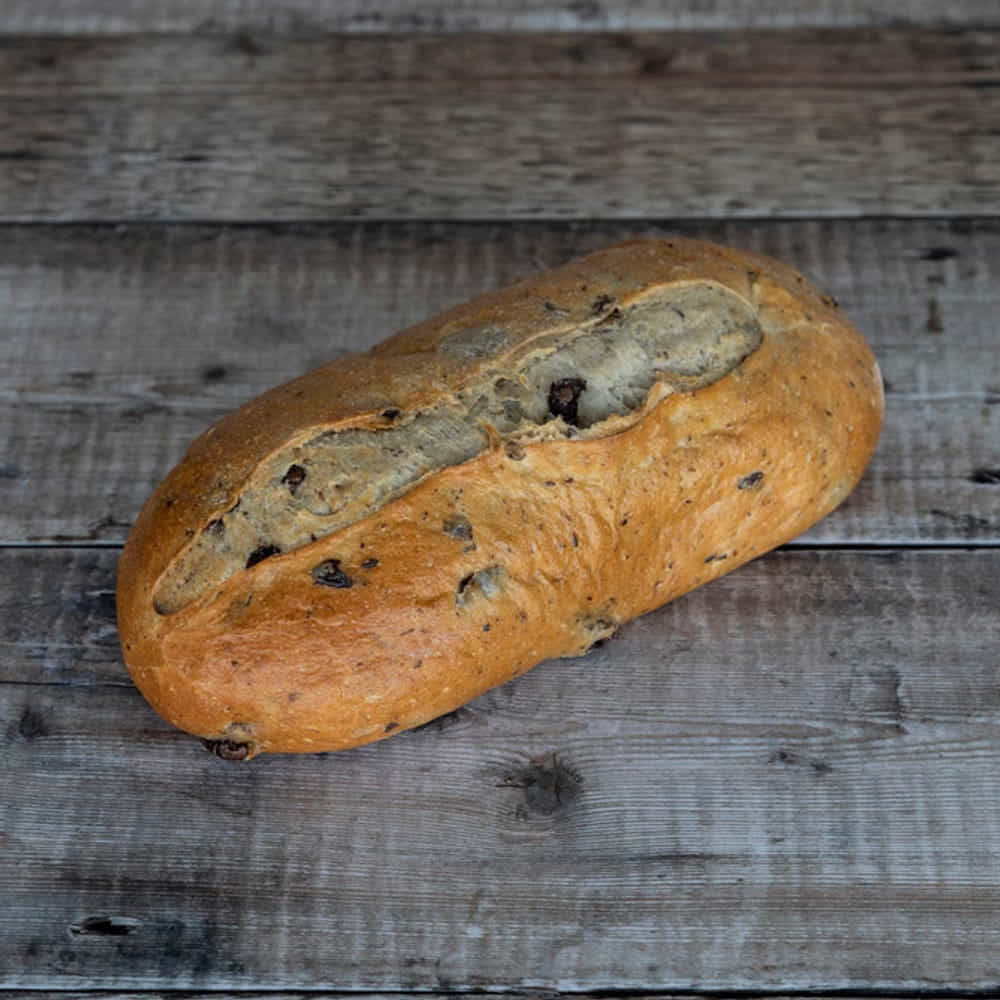 With authentic Kalamata Olives. Delicious loaf made with a 6% sourdough, full of pieces of Greek Kalamata olives and made with extra virgin olive oil.