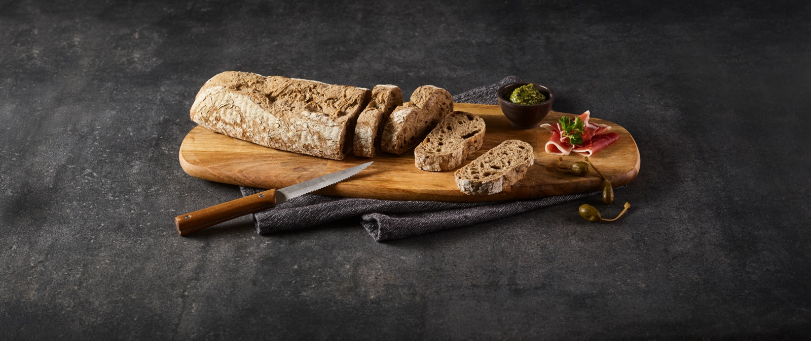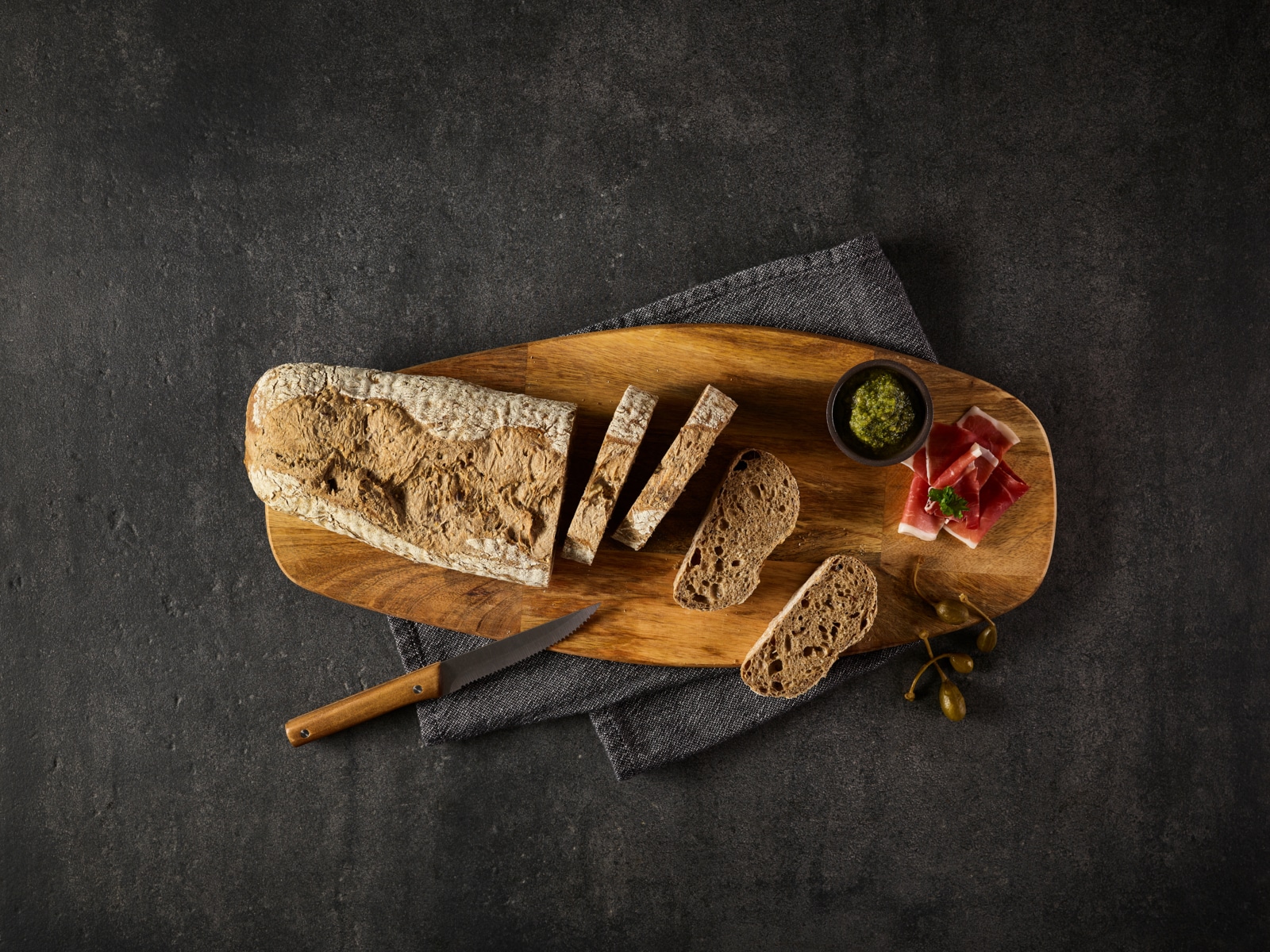 Artisanal and natural wheat bread (Italian style), with sesame seeds, linseed and barley malt, baked on stone and flour dusted