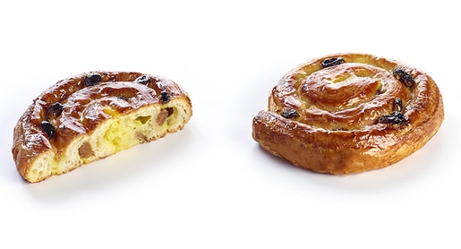 Classic French swirl of butter rich, laminated yeast dough with custard and juicy raisins, pre-egg washed. Made with 12% butter