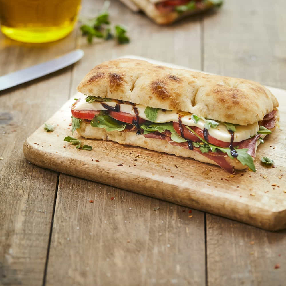 | Traditional Italian flat bread. A type of focaccia from wheat flour, with an open crumb structure, extra virgin olive oil and baked on stone. Ideal as sandwich carrier. |