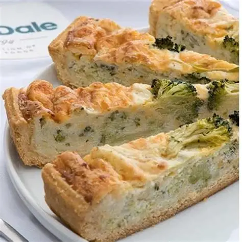A ready-baked, pre-cut (24 ptn) 11″ diameter quiche, made with British free-range eggs, broccoli florets, crumbled blue Stilton, mature Cheddar and onion, all topped with more fresh broccoli florets and baked in our in-house golden shortcrust pastry.