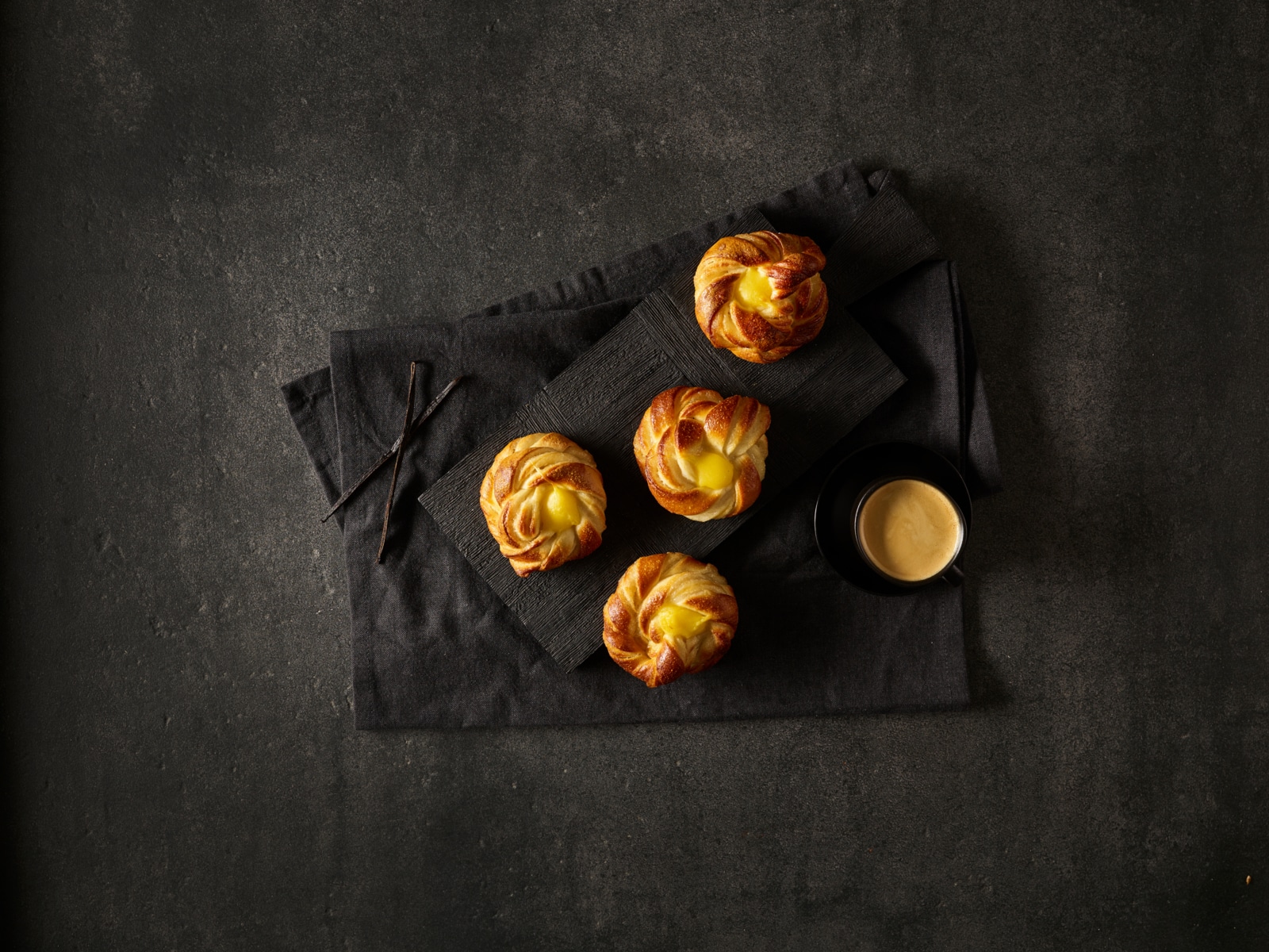 Ingredients:WHEAT flour, vanilla filling (18%) (sugar, water, modified starches, rapeseed oil, apricot kernels, citrus fibre, natural flavouring (vanilla) (1%), emulsifier (mono- and diglycerides of fatty acids), glucose syrup, salt, preservative (potassium sorbate)), water, custard filling (9%) (water, sugar, modified starch, whole MILK powder, whey powder (MILK), maize starch, colour (carotenes), thickener (xanthan gum), maltodextrine, natural flavouring), EGGS, sugar, yeast, rapeseed oil, iodised salt (salt, potassium iodate), acidity regulators (diphosphates, calcium phosphates), raising agent (sodium carbonates), BARLEY malt, palm oil (fully hydrogenated), emulsifier (mono- and diglycerides of fatty acids), thickener (guar gum), flour treatment agent (ascorbic acid). Reference Intake: Each 100g portion contains