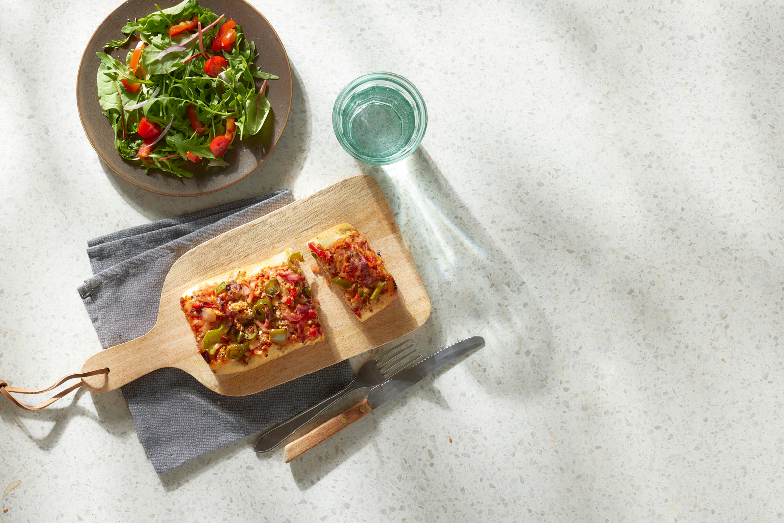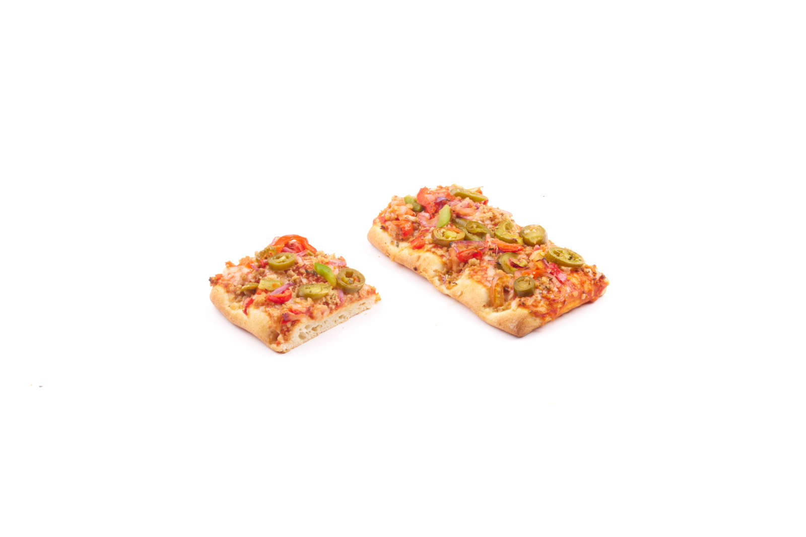 Soft and airy flatbread snack, richly topped with a tomato passata sauce flavoured with chipotle. Sprinkled with minced pork meat, sweet green and red paprika, red onion, green jalapeƱo peppers and grated Gouda cheese. Baked on stone.