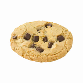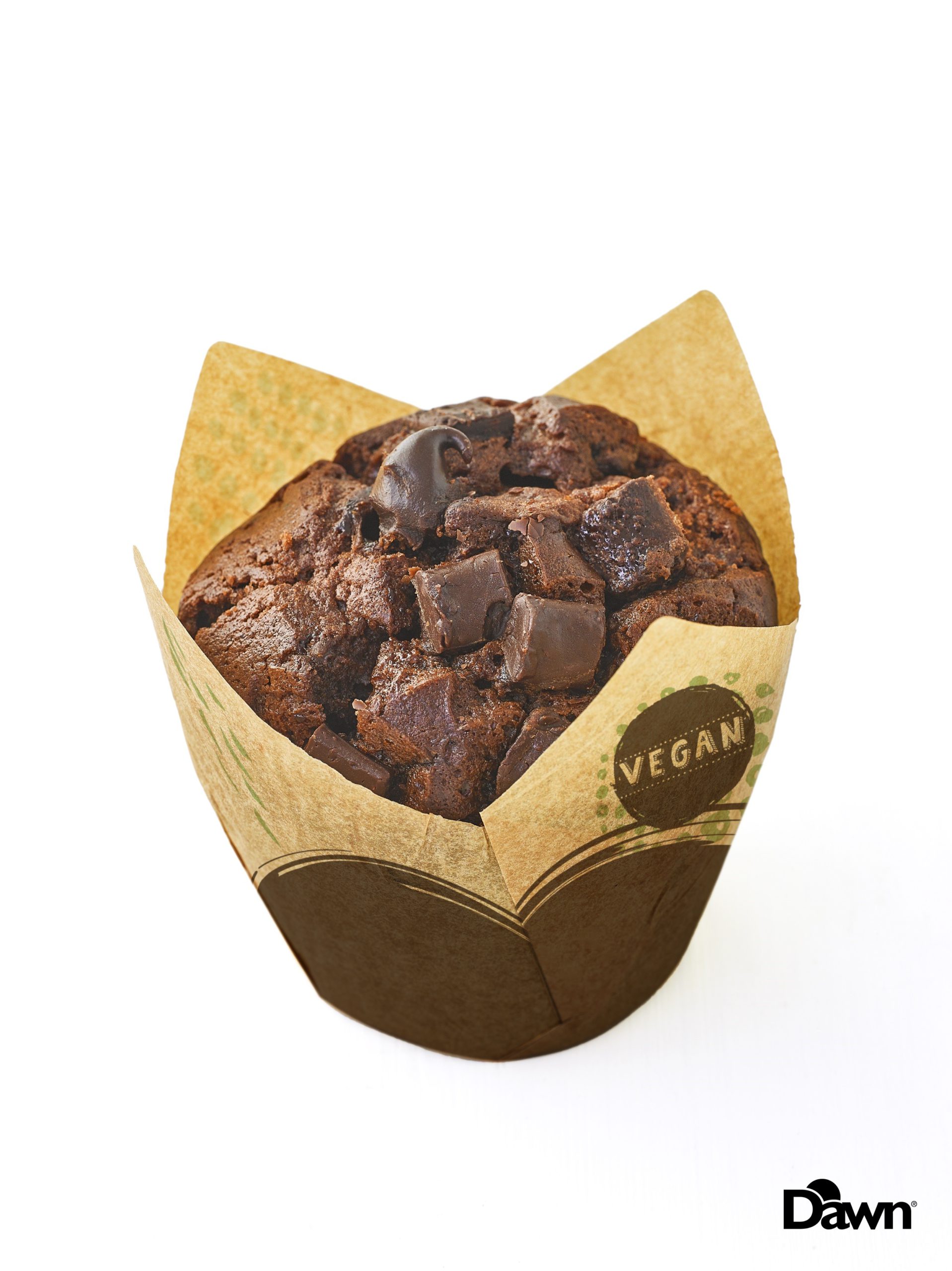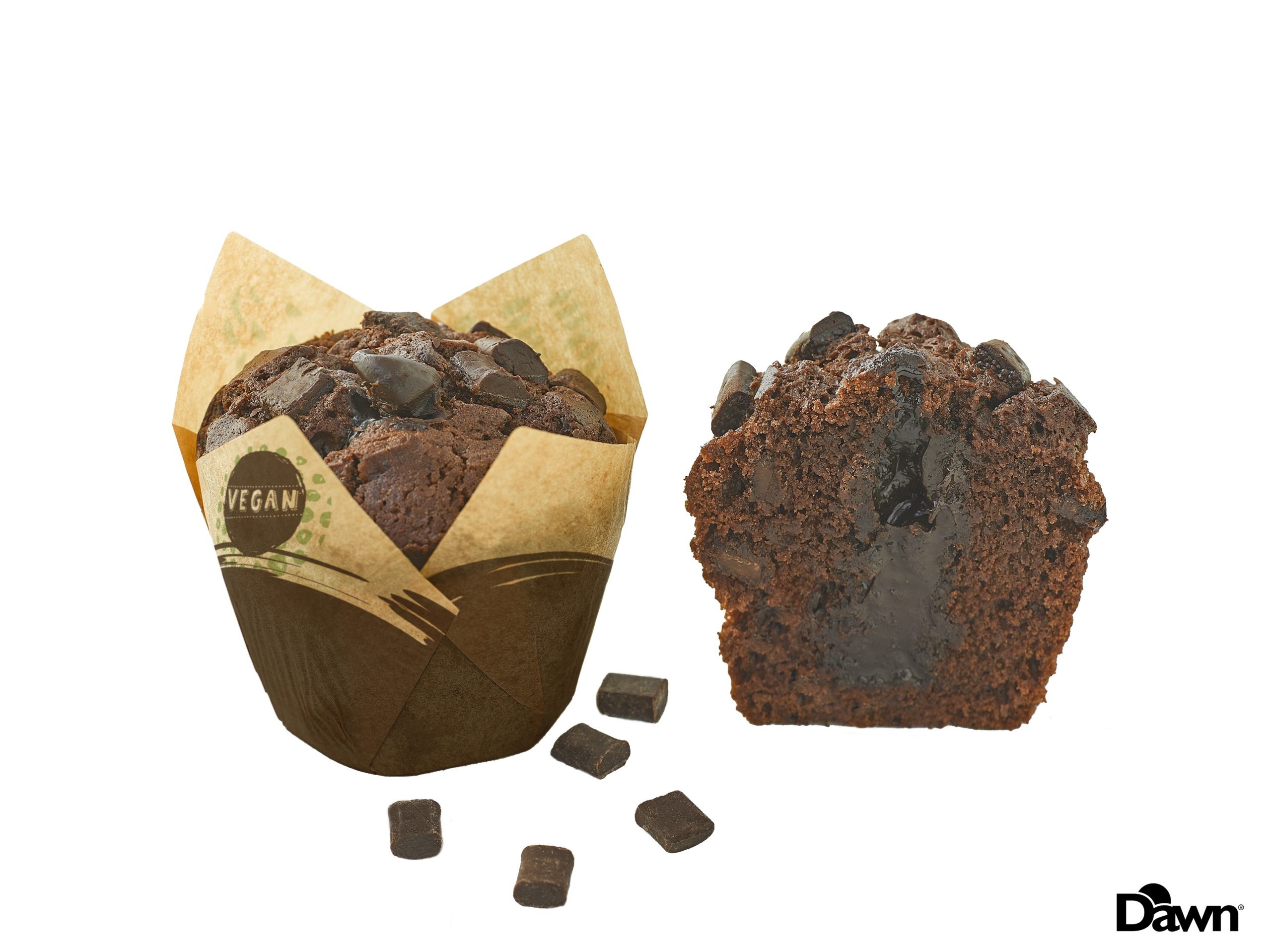 Individually wrapped chocolate muffin with plain chocolate chunks and a dark chocolate filling.
