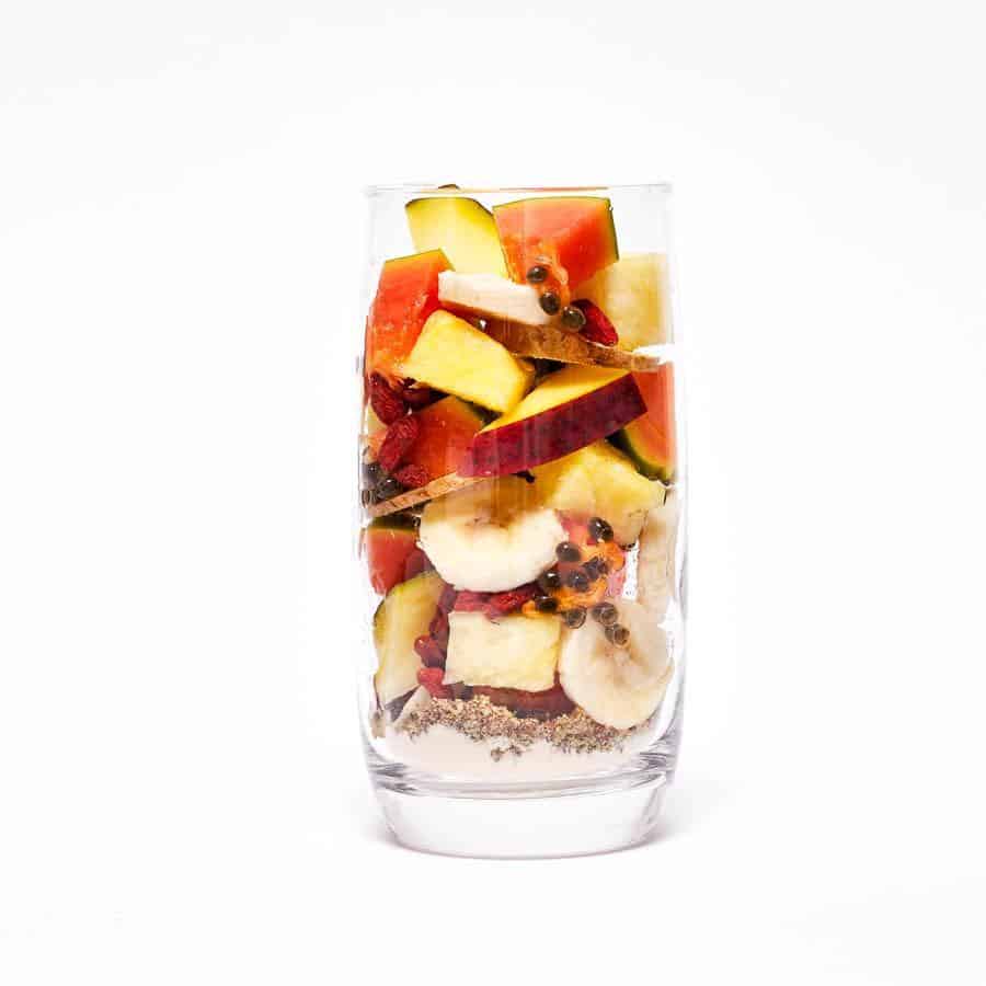 Fruit Pouch: Pineapple, Mango, Banana, Papaya, Ginger, Goji Berry Superfood Sachet: Flax Seed, Baobab, Pumpkin Seed, Sunflower Seed